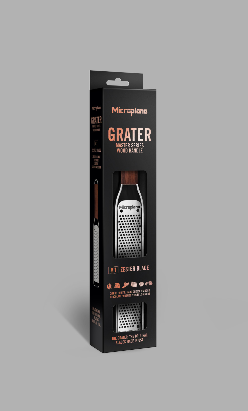 A Microplane® Exclusive reszelőcsaládja a Master széria, az új kollekció az elegancia és minőség megtestesítője, amiben egyesítették a diófa szépségét a rozsdamentes acél időtállóságával. A Microplane ikonikus famegmunkáló termékeinek örökségét és a mai modern kézműves stílust tükrözi. A Master széria modern stílusban, tartósságban és hibátlan teljesítményben a legjobbat kínálja. A kivételesen szép, olajozott diófa nyél (Amerikából származó diófa) kényelmes a kéznek, ugyanakkor melegséget és eleganciát kölcsönöz konyhánknak. Tökéletes munkát végez minden alkalommal, ezért a Master széria a tökéletes választás a konyhában tevékenykedő művész számára.