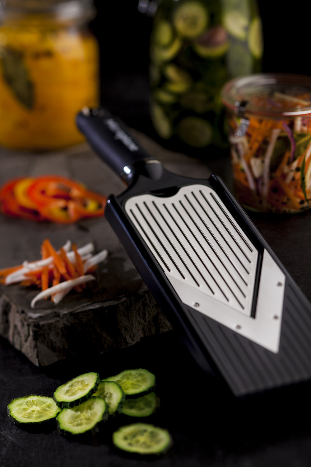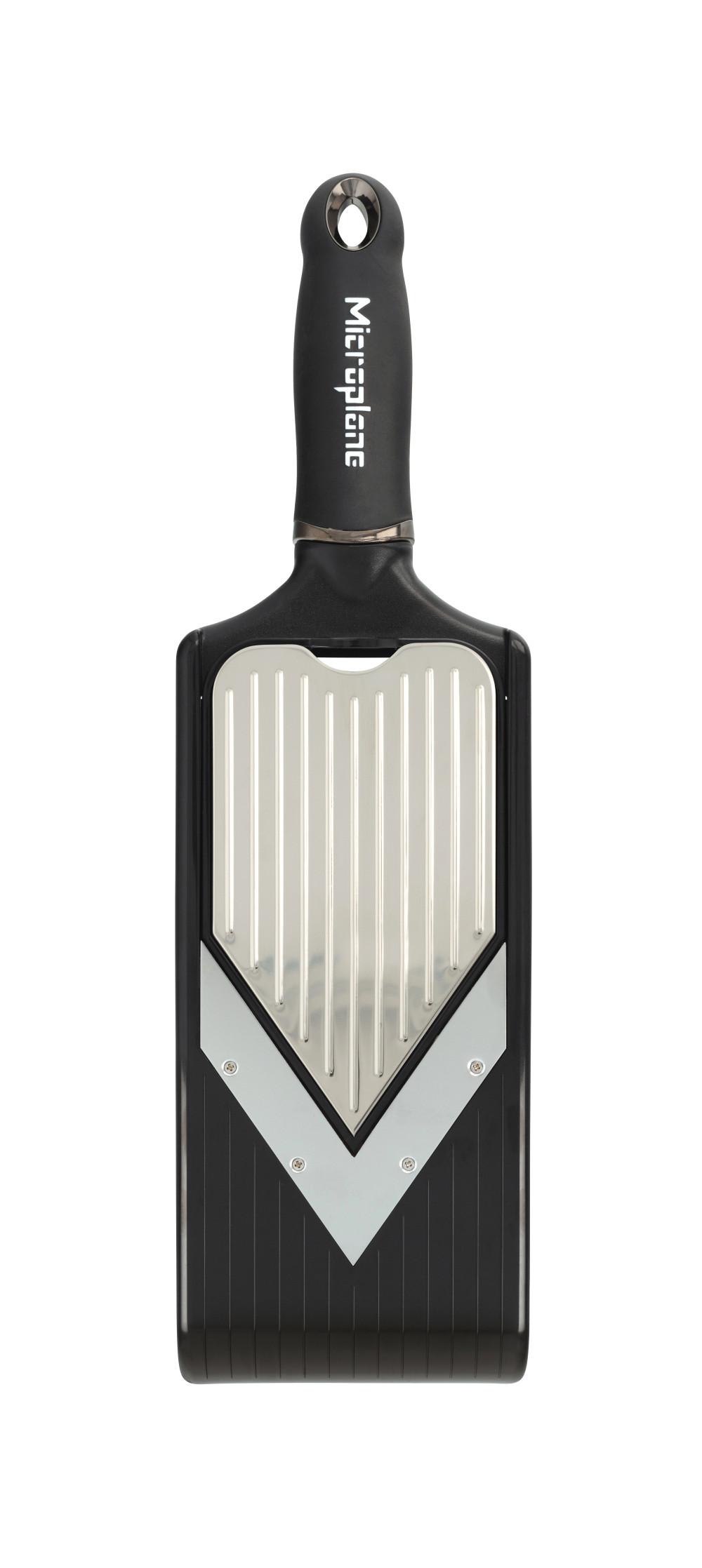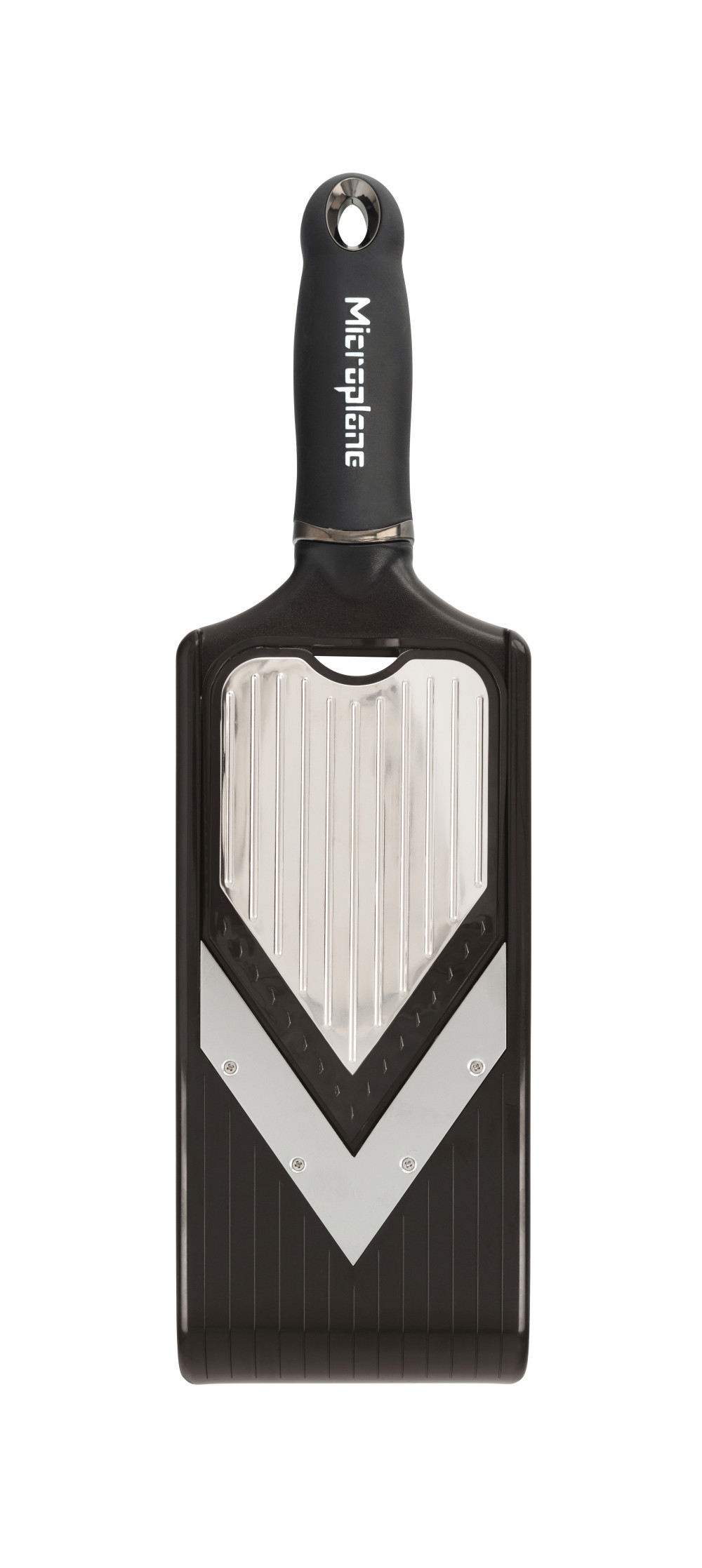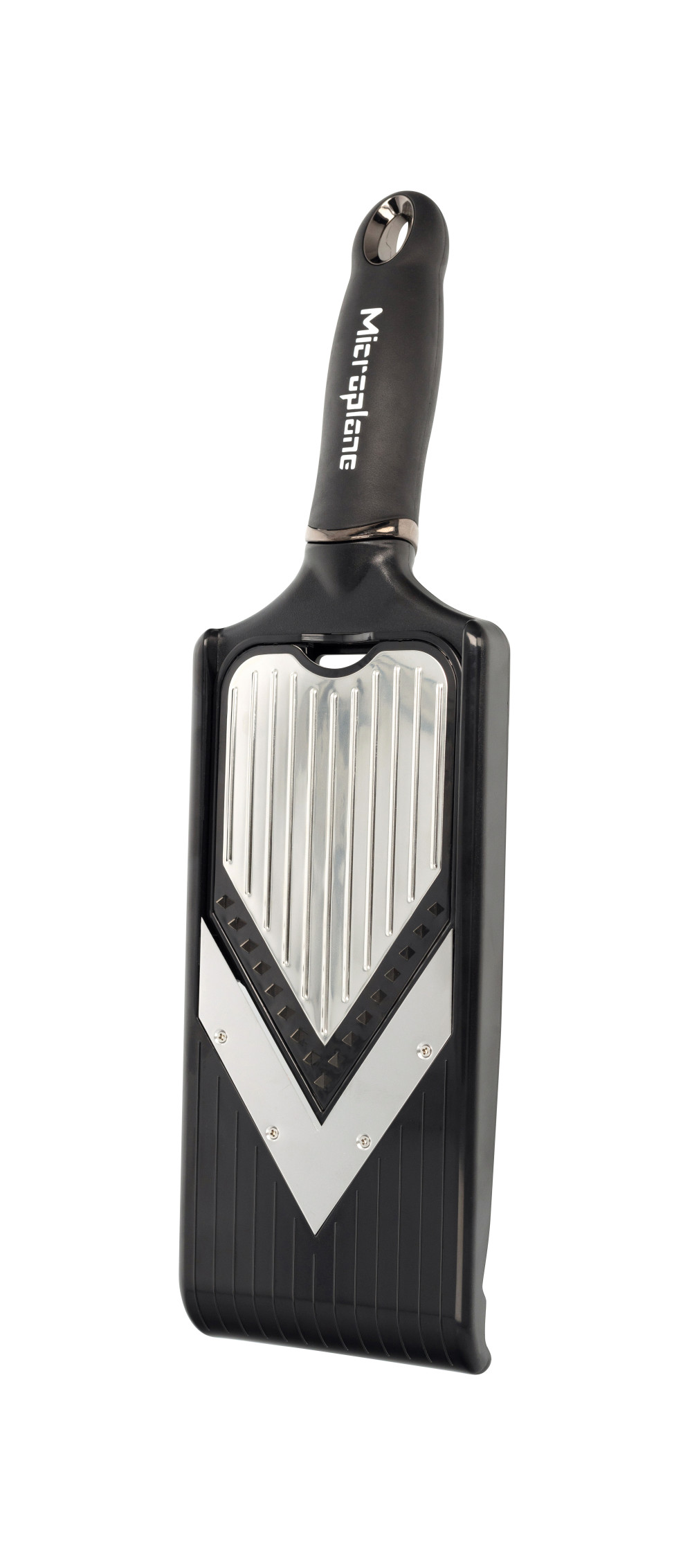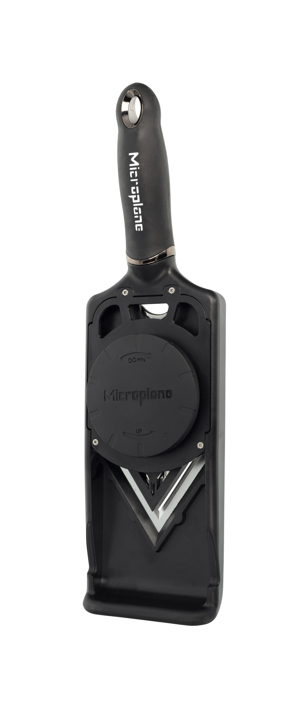Az állítható V-pengés szeletelő julienne funkcióval a Microplane legújabb, gondosan megtervezett konyhai eszköze, két felhasználási lehetőséggel. A széles, hosszú élettartamú, rendkívül éles, rozsdamentes acél V-penge gyorsan, könnyedén és pontosan szeletel számos gyümölcsöt, zöldséget és sajtot. Az állítógomb segítségével változtathatja a szelet vastagságát papírvékonyról vastagra, és mindent, ami a kettő között van! Fordítsa meg a kivehető felületet, hogy a V-pengéről a julienne-re váltson. A tartós, borotvaéles rozsdamentes acél fogak precízen, szakadás nélkül vágják vékony, egységes csíkokra az összetevőket.A csúszásmentes alj védi a munkalapot vágás közben, a tálrögzítők pedig stabilitást biztosítanak a serpenyők vagy tálak feletti függőleges reszeléskor. Vágja le az összetevőket az utolsó szeletig a mellékelt univerzális kézvédőnek köszönhetően.Használja a julienne funkcióval ellátott állítható V-pengét uborka, cukkini, hagyma, sajt és paradicsom szeleteléséhez, szendvics- és burger feltétekhez, a julienne-t pedig zellerhez, almához, körtéhez és paprikához, hogy színes, tápláló salátákat készíthessen. Használhatja krumplihoz és fantasztikus dekorációk készítésére.Termék leírása / jellemzői:A julienne funkcióval rendelkező kompakt V-pengés szeletelő (mandolin) két felhasználási opciót kínál:hosszantartó, ultraéles V-penge – könnyedén és pontosan vágja szeletekre a gyümölcsöket, zöldségeket és sajtokat;rendkívül éles Julienne fogak – az összetevőket hosszú, vékony, egységes csíkokra vágja;megfordítható felület – fordítsa meg a kivehető felületet, hogy szeletelésről Julienne csíkokra váltson;állítógomb – válassza ki a szelet vastagságát. Válasszon a papírvékonytól a vastagig;csúszásmentes láb- és tálrögzítők - stabilitást biztosít, és lehetővé teszi a szeletelést közvetlenül a tál felett;ergonomikus, puha tapintású fogantyú és tárcsa - csúszásmentes és könnyen fogható;univerzális kézvédő a csomagban – biztonságosan tartja az ujjakat szeleteléskor, bármelyik kézzel használható;könnyű tisztítás: egyszerűen öblítse le folyó víz alatt / mosogatógépben moshatóMéretek: 10,3 cm x 5,5 cm x 36 cm